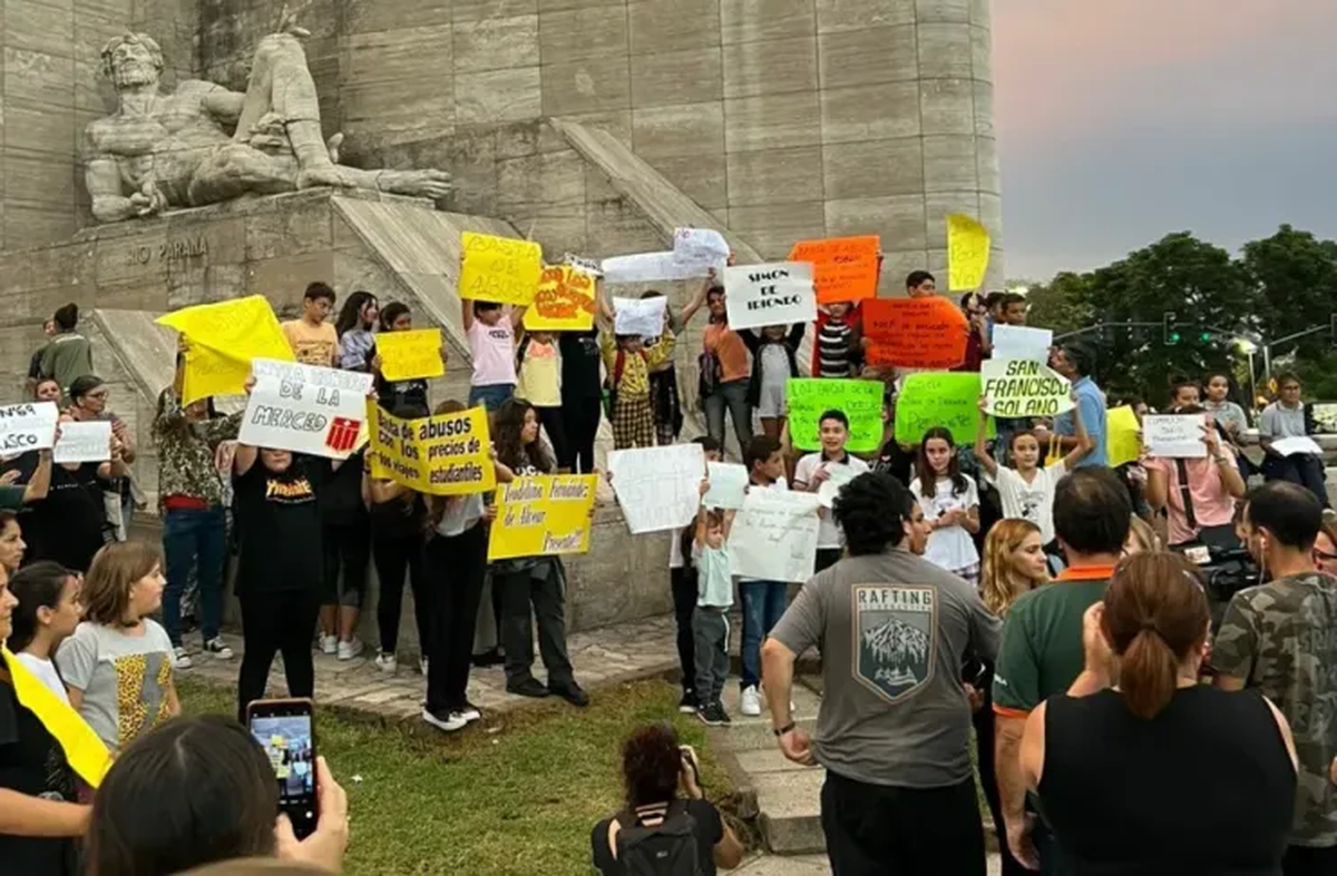Padres y madres de 120 escuelas primarias se manifestaron en el Monumento de la Bandera y aseguran que reclamarán la intervención del Ministerio de Turismo de la Nación para controlar y regular las tarifas de las excursiones educativas.