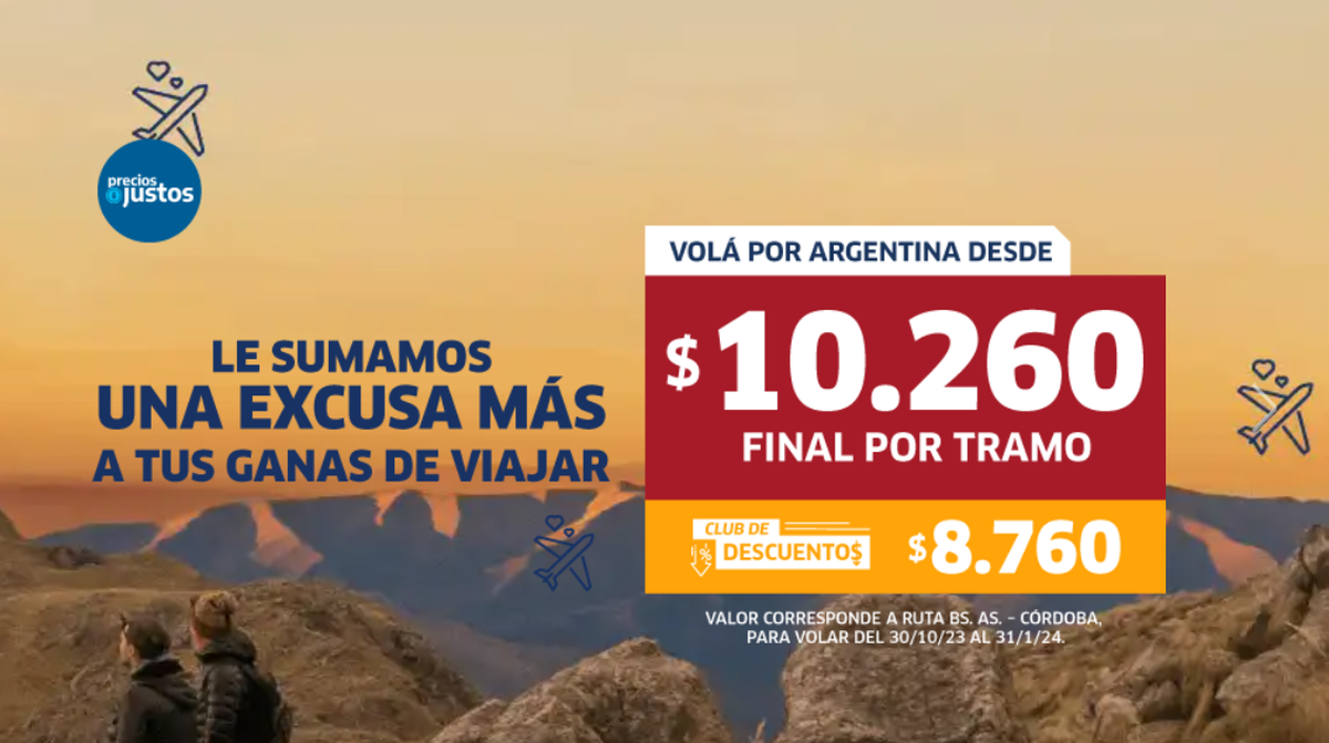 La low cost JetSmart actualmente, ofrece para la ruta de Buenos Aires - Córdoba pasajes de alrededor $10.000 (final con impuestos - por tramo). Esto es para viajar entre el 30 de octubre y el 31 de enero de 2024. Por lo que es ideal para aprovecharlo en vacaciones de verano.