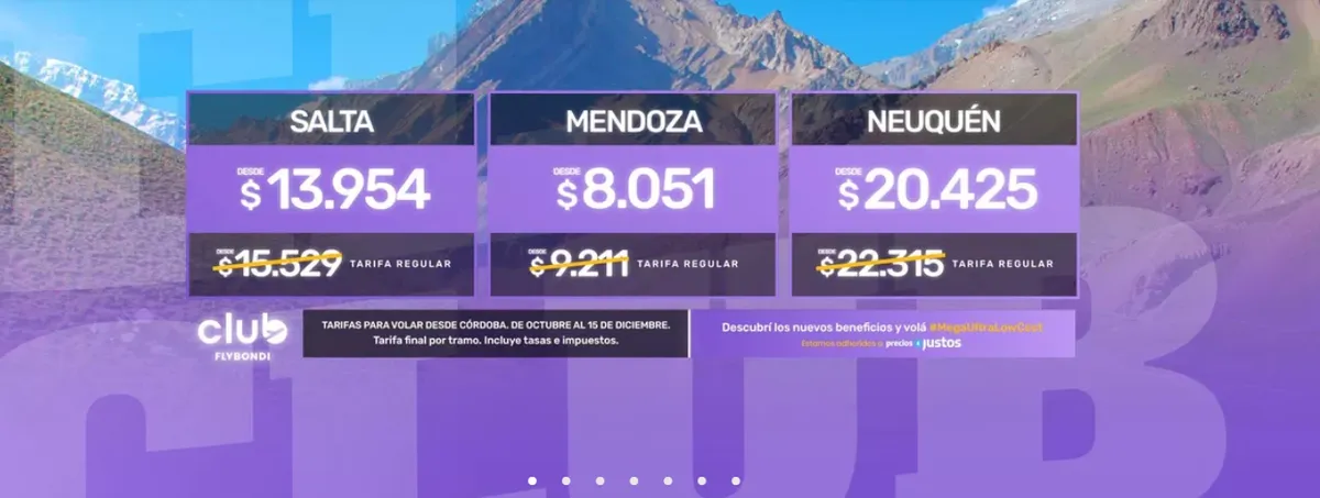 En el caso de Flybondi, la low cost amarilla lanzó tarifas con Precios Justos (por tramo y con tastas e impuestos incluidos) para volar desde Córdoba hacia:
