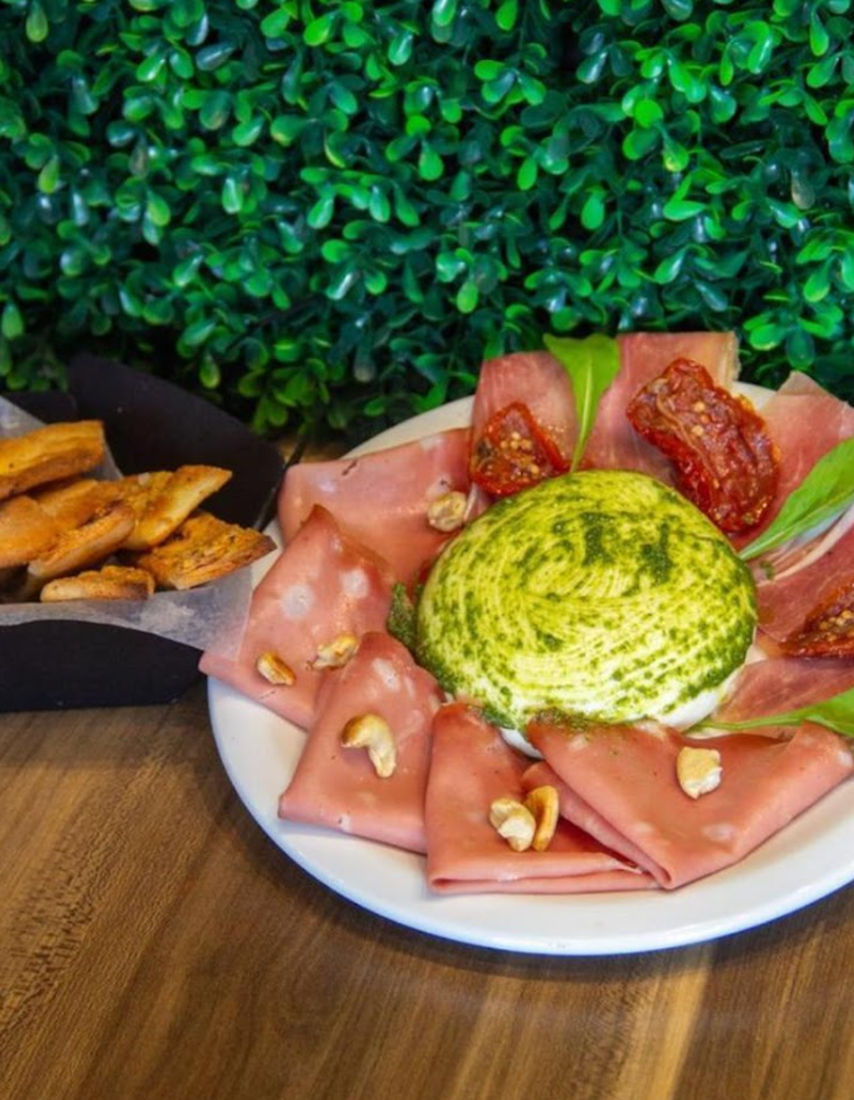 - Burrata mixta: mortadela con pistachos, jamón crudo, rúcula, castañas tostadas y pesto.