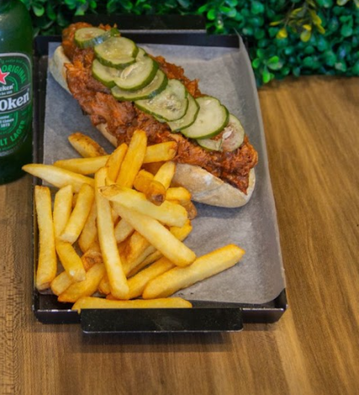 - Pulled pork: bondiola braseada con 6 horas cocción, cebollas caramelizadas, barbacoa y pepinos agridulces en pan italiano ciabatta.