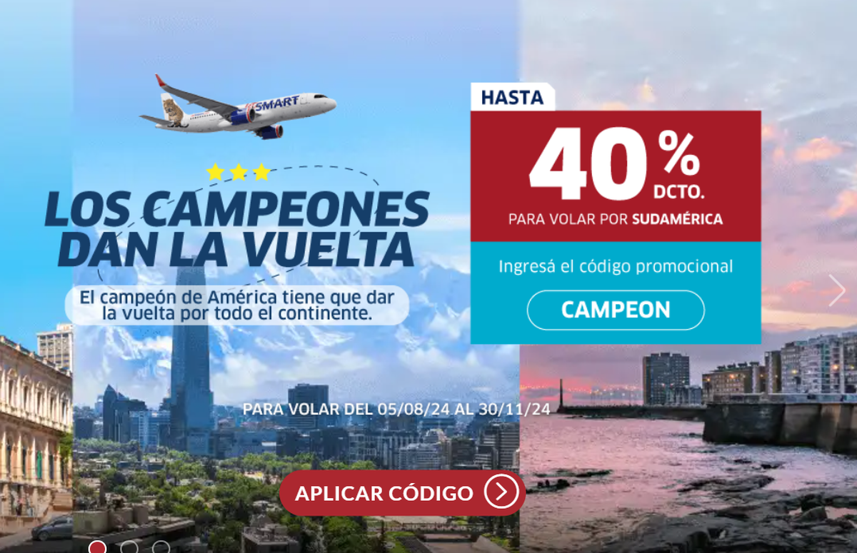 Para que los argentinos campeones de América "den la vuelta" por el continente, la low cost lanzó vuelos con hasta 40% OFF. en todos los destinos de Sudamérica. Esto es válido para volar del 5 de agosto de 2024 al 30 de noviembre de 2024.