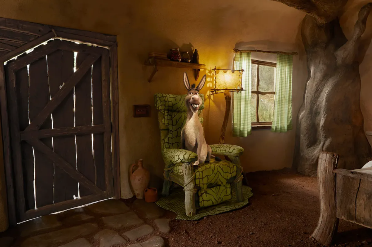 El adorable compañero de Shrek, Burro, es la voz detrás del listado oficial de Airbnb: "Estoy sentado en el pantano y estoy absolutamente encantado de invitarte a una estadía de cuento de hadas". “ Ah, y no te preocupes por los carteles de 'CUIDADO'. Probablemente sean para decoración”, asegura.