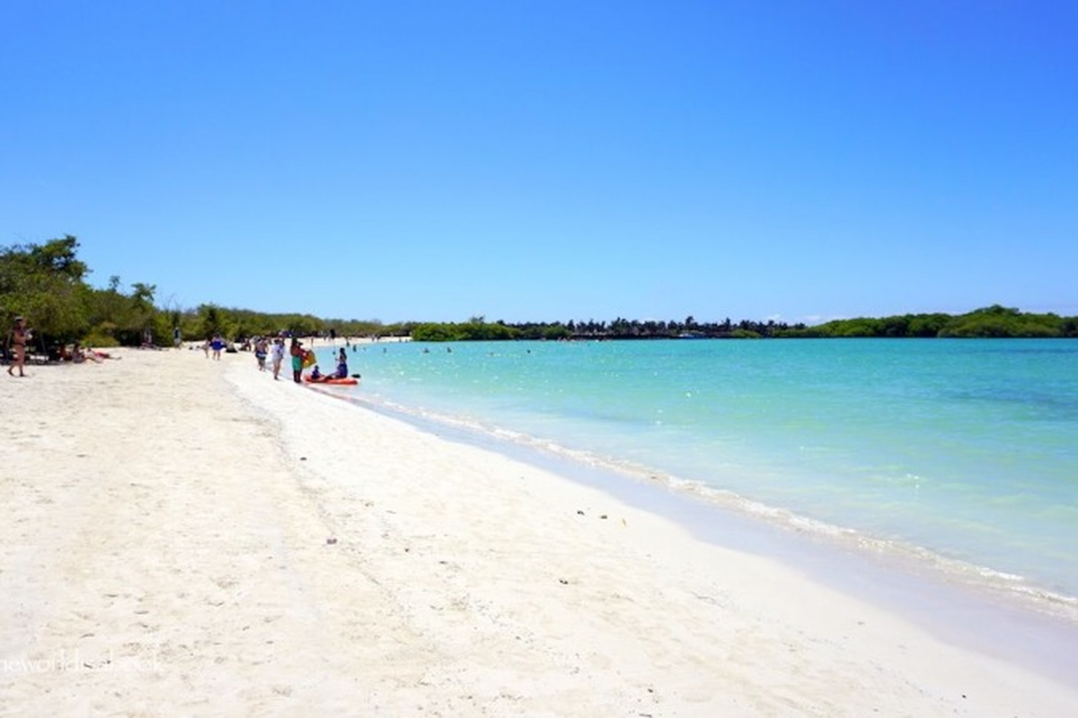 Bahía Tortuga está ubicada en la isla de Santa Cruz en Galápagos, Ecuador. Es realmente paradisíaca, con sus arenas blancas como si fuera talco y aguas turquesas.