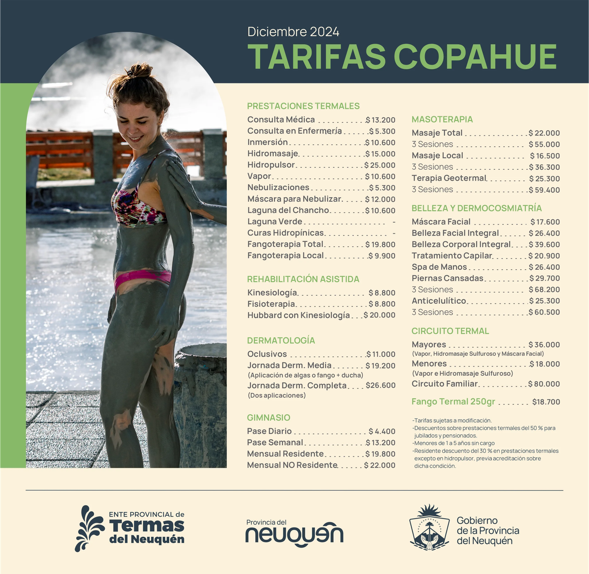 Los precios de diciembre 2024, rondan los $36.000 el circuito termal para mayores. Esto incluye vapor, máscara facial, hidromasaje, sulfuroso y máscara facial). Los menores abonan $18.000 y el circuito familiar $80.000.