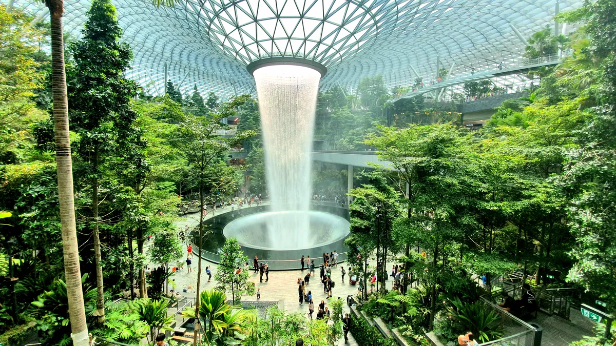En Singapur. Se trata de un aeropuerto que tiene un bosque, una imponente cascada (la estrella del aeropuerto que deja impactados y enamorados a los turistas) y además un hotel donde alojarse y relajarse previo a embarcar.