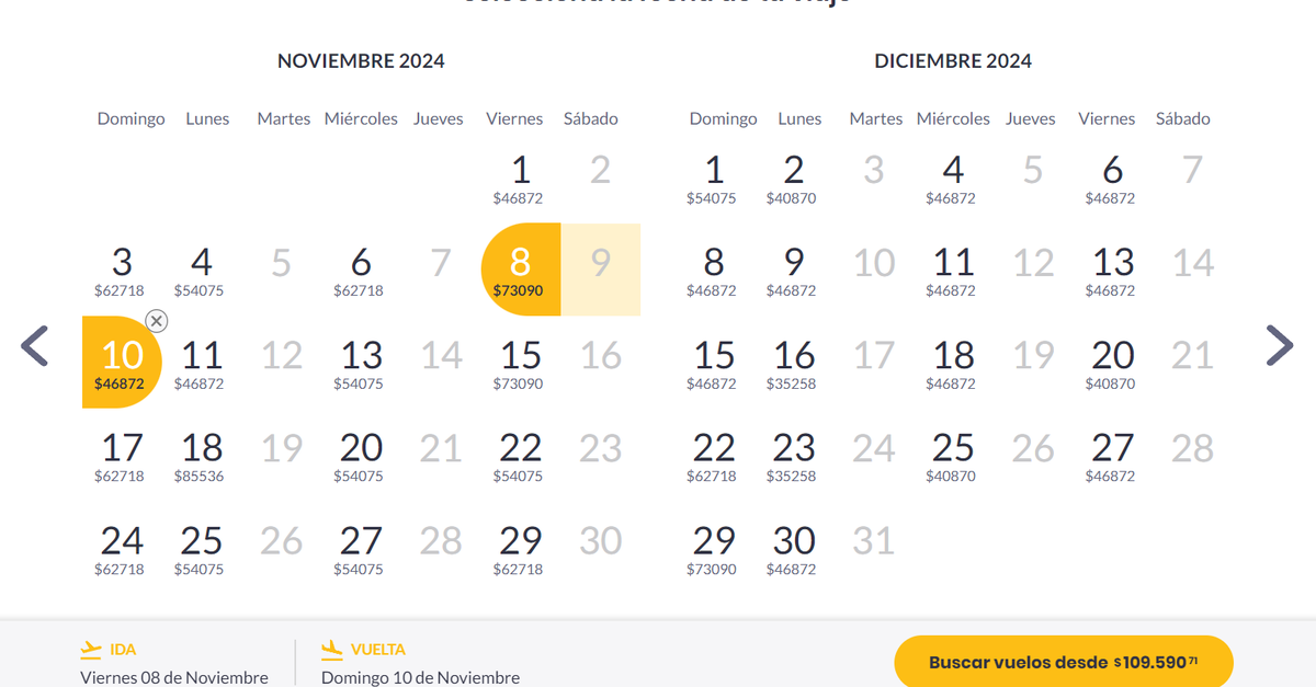 Con precios accesibles, se consiguen pasajes desde $46.872 por tramo, dependiendo las fechas. Por ejemplo, en diciembre hay una gran cantidad de fechas con pasajes a este precio.
