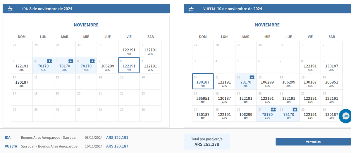 Mientras que por Aerolíneas Argentinas, en las mismas fechas (viernes 8 al domingo 10/11), el precio final de pasajes ida y vuelta es de $252.300.