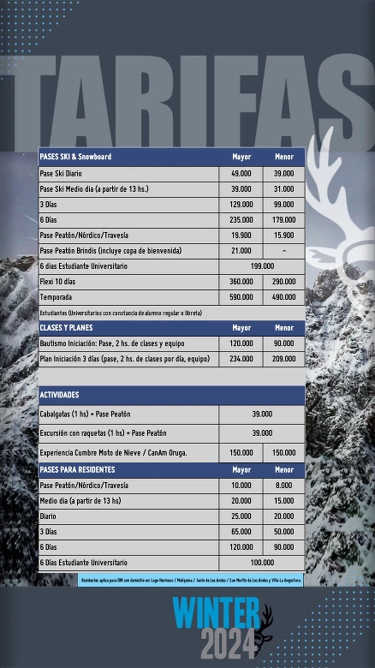 Los precios al 26/06 son el pase diario de ski y snowboard para mayores $49.000. Mientras que el del Cerro Catedral cuesta en torno a los $110.000.