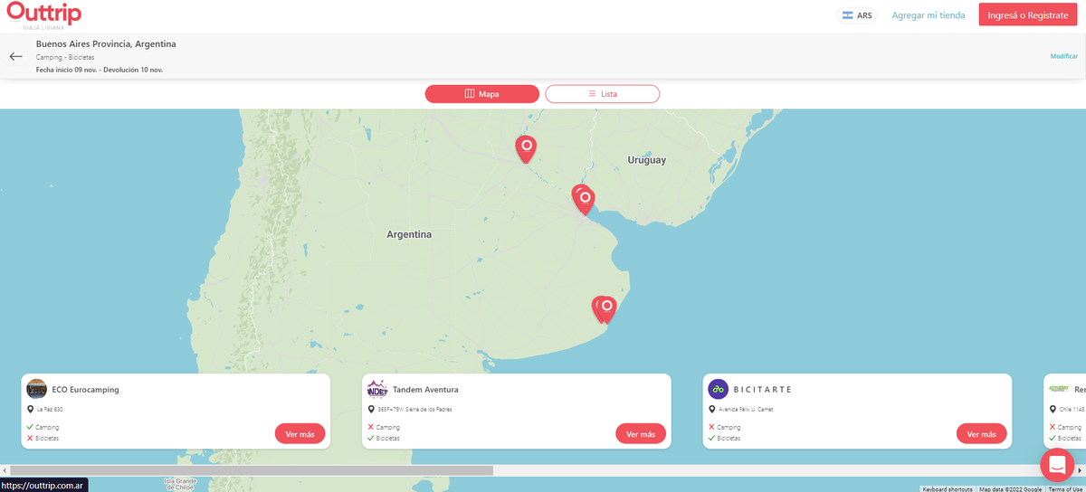 - Cuándo uno ingresa a la página oficial podrá ver que brinda diferentes destinos de la Argentina, dónde uno podrá alquilar equipamiento. Algunas de las provincias son Buenos Aires (San Isidro, Tigre), Mendoza, Córdoba, San Luis, Neuquén y Río Negro.