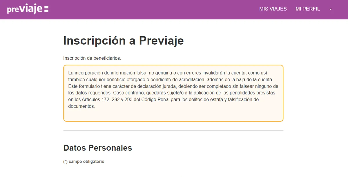 - Una vez inscripto se podrán comenzar a cargar los comprobantes desde "MIS VIAJES". Allí se debe crear el perfil del viaje y especificar origen, destino, fecha de salida y regreso.