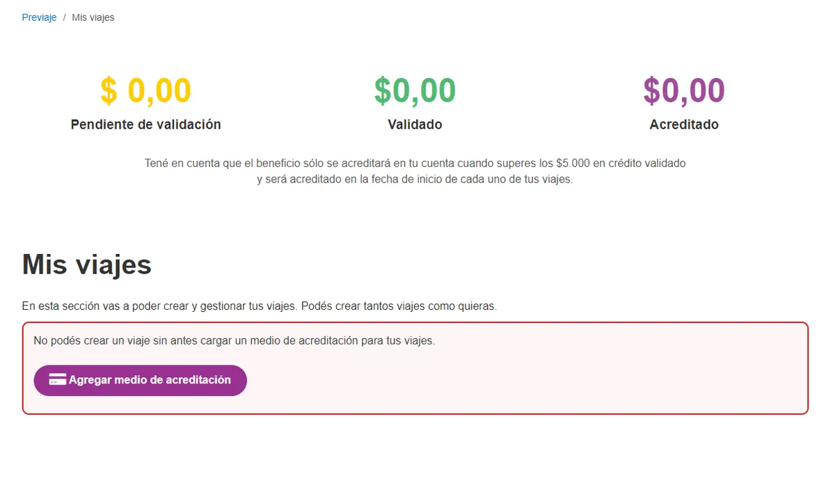 - Por último, se deberá agregar medio de acreditación (es decir, la tarjeta Previaje donde se acreditará el reintegro, que se podrá generar en el momento o utilizar la anterior en el caso de disponerla), mientras que se podrán cargar las facturas que estarán pendientes de validación hasta que el sistema determine si son validas o no.