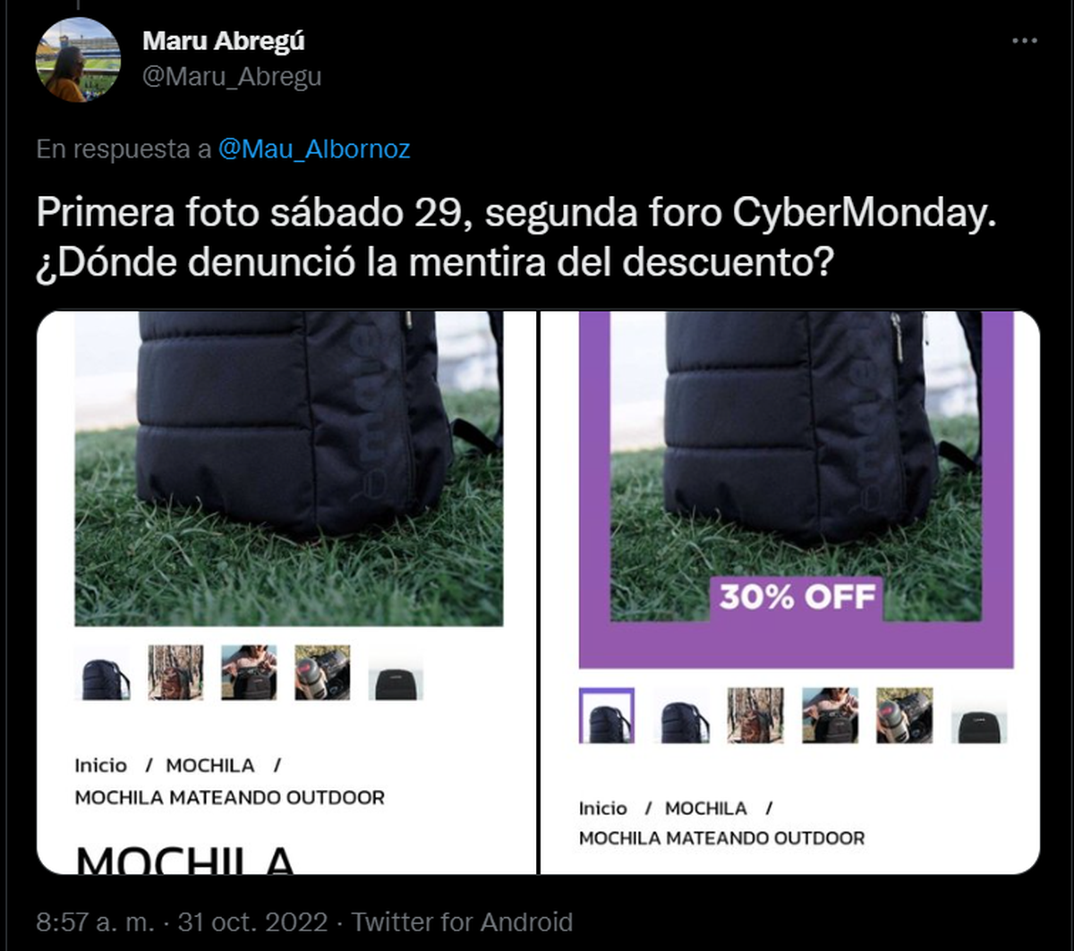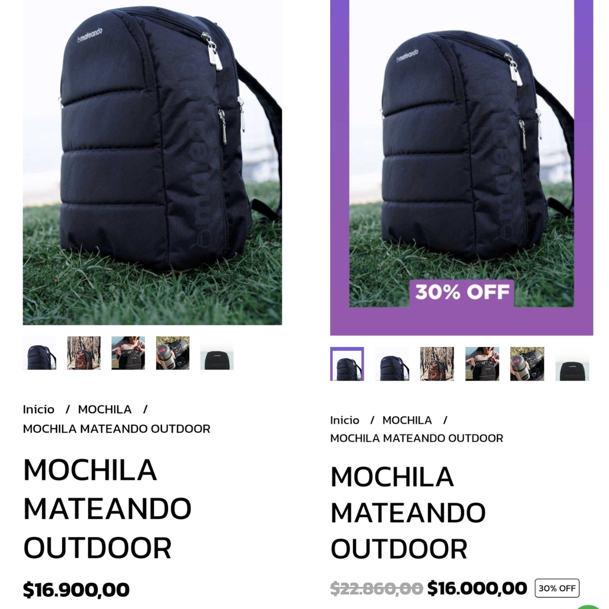En la tienda Mateando, una mochila que previo al evento se encontraba a $16.900 actualmente se encuentra en oferta a $900 menos. Pero el precio que figura es de $22.860, casi $6.000 más. Por lo que no se trata de un 30% de descuento real, ya que si nos basamos en su precio anterior al Cyber Monday tendría que rondar los $11.000.