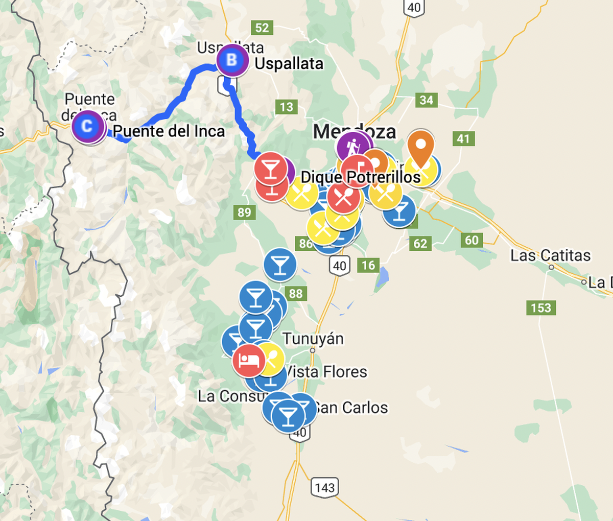 La ruta 7 abre dos posibilidades hacia el este y el oeste. Si uno toma el camino hacia el este se encuentran las mayores bodegas en Rivadavia, San Martín, Junín y Santa Rosa. También, cabe mencionar que se encuentran las termas de Cacheuta, Potrerillos para turismo aventura y Uspallata, imperdibles para visitar.