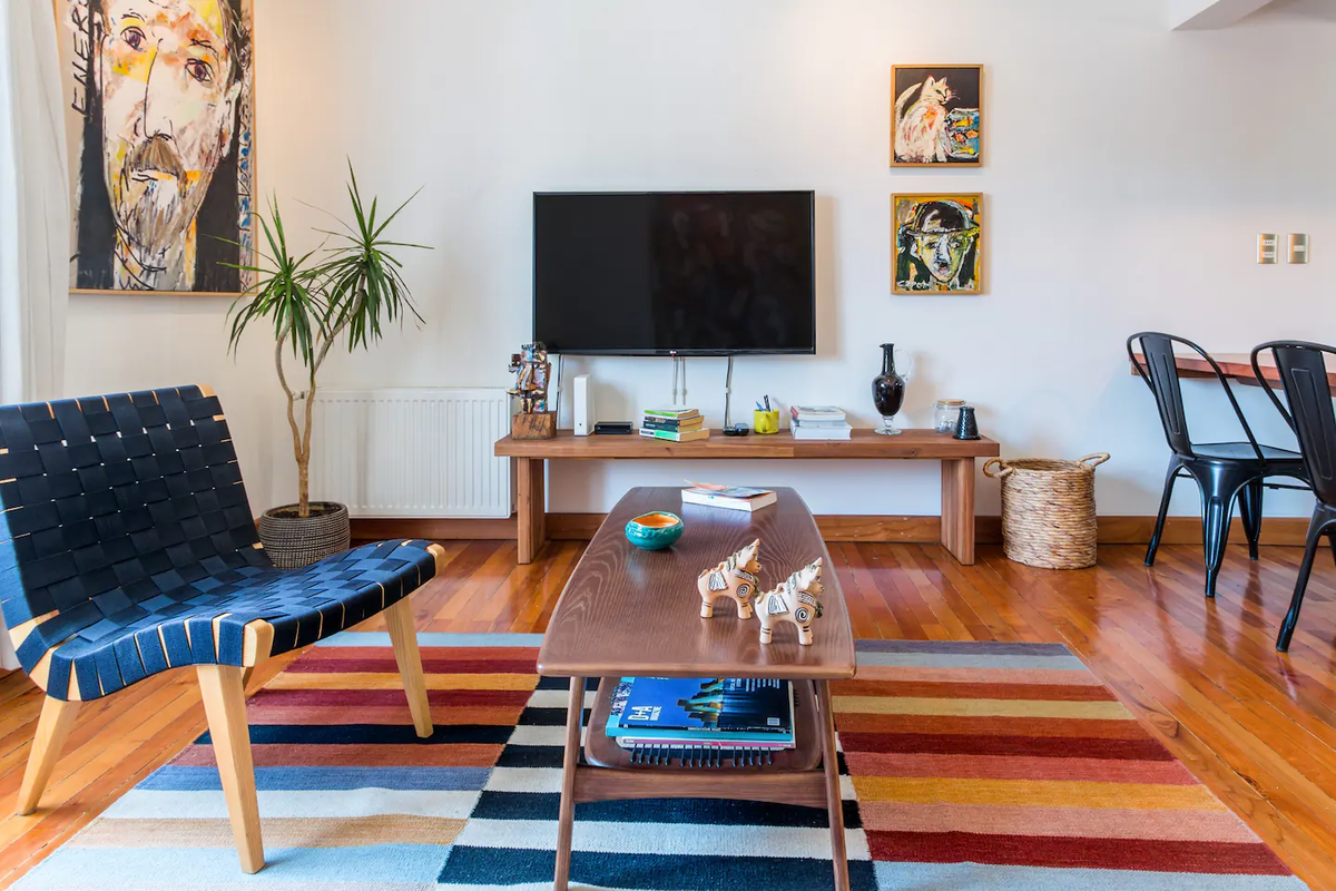 Tiene dos habitaciones y un baño, además de que cuenta con Wi-Fi. Sus paredes se encuentran repletas de obras de arte y es muy espacioso y luminoso. Tiene entrada privada, terraza, techos altos, piso de madera y una cocina totalmente equipada.