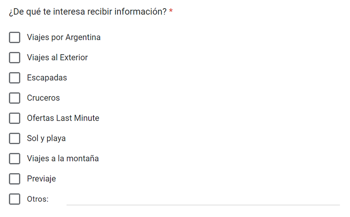 - Luego, la página redireccionará a un formulario donde se debe completar el mail personal y qué tipo de ofertas desea uno recibir: ya sean de viajes dentro del país, al exterior, escapadas, cruceros, ofertas de último minuto, otras que combinen con Previaje y más.