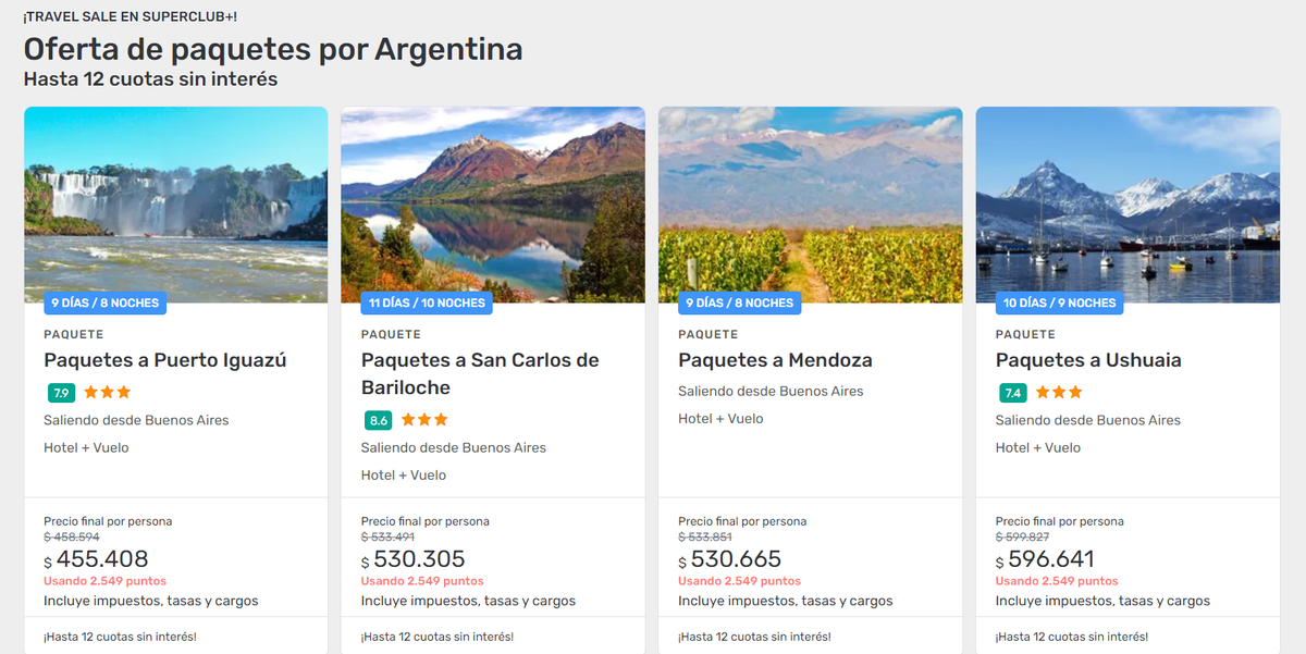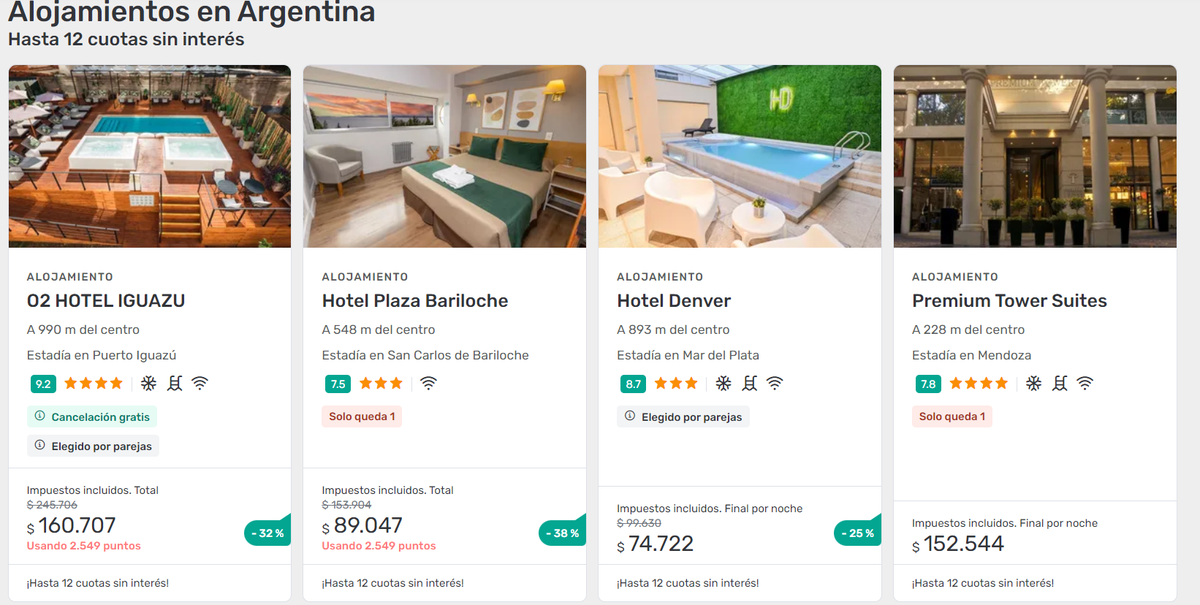 Hay ofertas en Puerto Iguazú, Bariloche, Mendoza, Ushuaia, Mar del Plata para aprovechar las cuotas. Además, uno si quiere puede canjear puntos, mientras más puntos tenés más barato queda el precio.