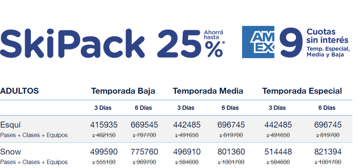 - 25% de descuento y 9 cuotas sin interés con American Expess en Ski Packs. Es decir, adquiriendo un paquete para esquiar que incluye pases, clases y equipos por ejemplo, por 3 días: alrededor de $416.000 en 9 cuotas sin interés.