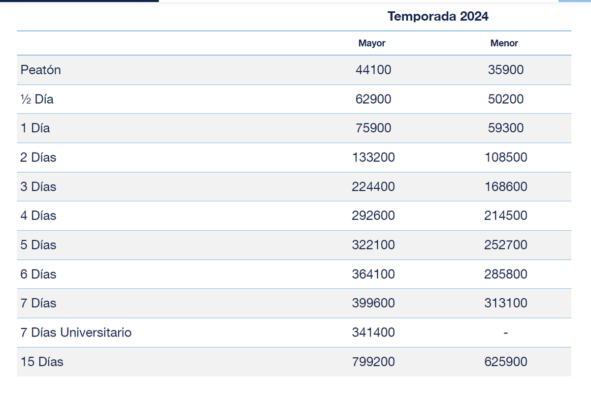 El precio de los pases diarios para esquiar es de $75.900 (mayores) y $59.300 (menores). La mitad de lo que sale el Cerro Catedral, es decir que dos personas esquían por el precio de una en este centro de ski.