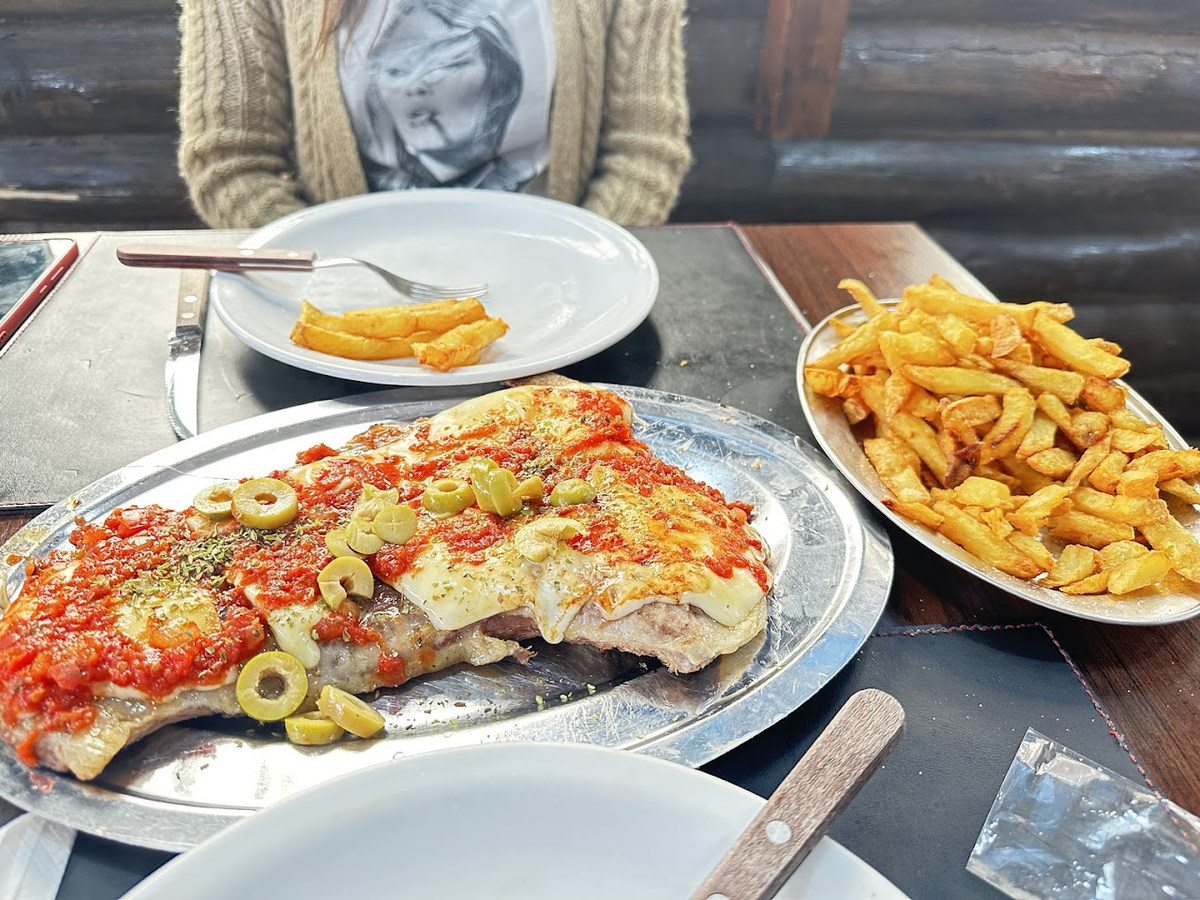 Uno de sus platos más destacados, además de la parrillada para 2 ($40.000 con guarnición), para 4 (es enorme), para 5 y para 6, es el matambrito a la pizza con papas fritas: salsa, queso y aceitunas (ronda los $22.000 con guarnición para compartir). Las guarniciones pueden ser ensalada, fritas, puré de papa o calabaza.
