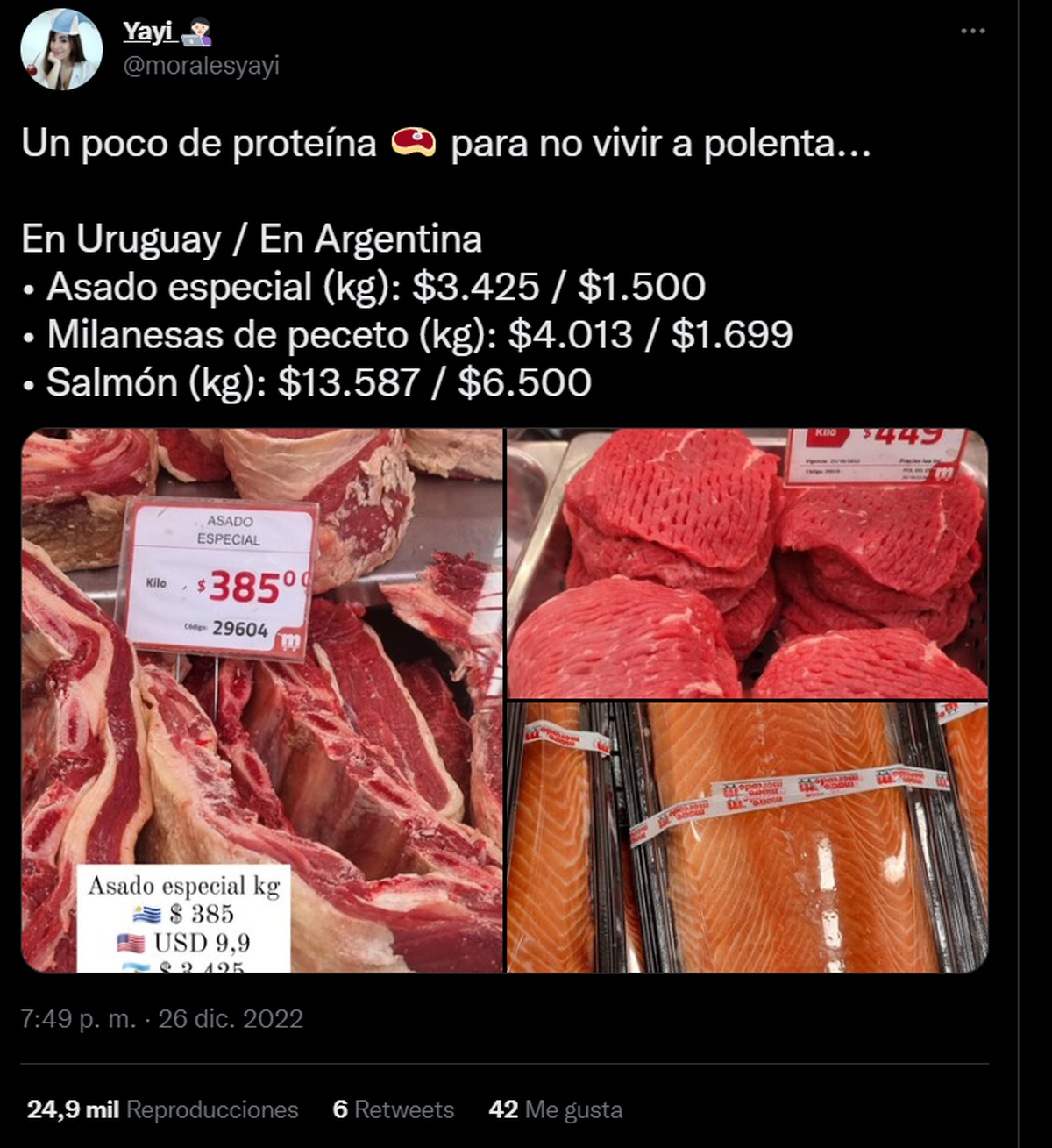 La comparación se basó entre un supermercado "considerado económico" en Maldonado y un supermercado argentino (Coto Digital), según contó @moralesyayi. Además, tuvo en cuenta un dólar a $346.