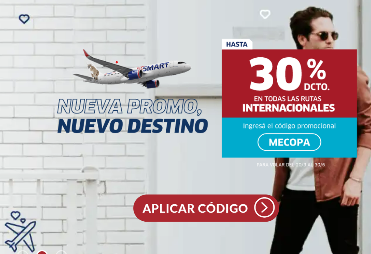 - Por otro lado, la low cost ofrece pasajes con 30% de descuento en todas las rutas internacionales. Para viajar hacia Brasil, Chile, Perú y Paraguay.