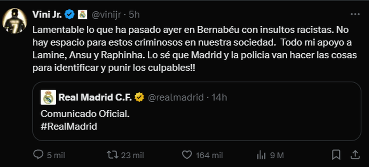 "Lamentable lo que ha pasado ayer en Bernabéu con insultos racistas. No hay espacio para estos criminosos en nuestra sociedad. Todo mi apoyo a Lamine, Ansu y Raphinha. Lo sé que Madrid y la policia van hacer las cosas para identificar y punir los culpables!!", escribió Vinicius solidarizándose con Lamine Yamal, Ansu Fati y Raphina.