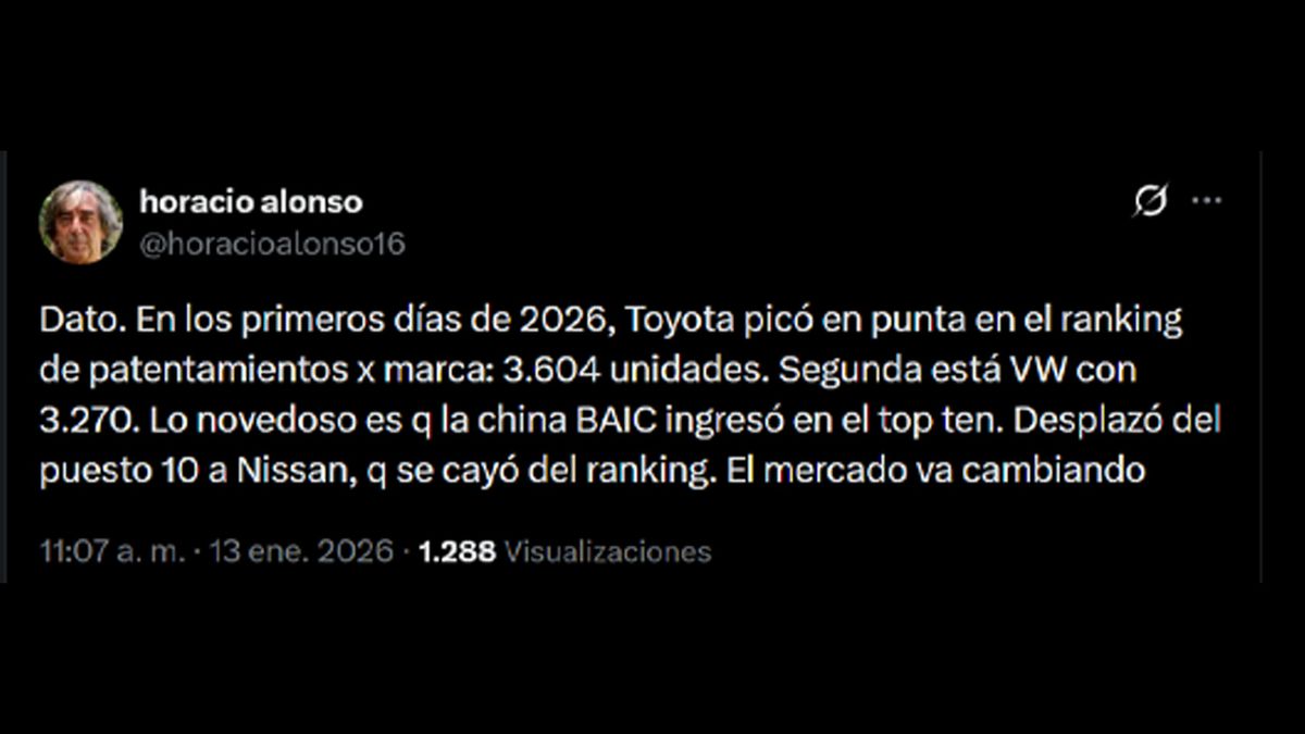 De hecho, el primer mes del 2026 (enero) ya refleja una acentuación de esa tendencia. Datos iniciales reportados por el periodista especializado Horacio Alonso dieron cuenta de un avance de BAIC, marca china líder en Argentina, hacia el top 10 marcas más patentadas del mes, desplazando a una automotriz tradicional como la japonesa Nissan.