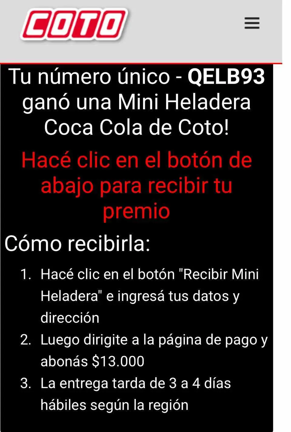 Lo que resulta particularmente preocupante es la diversidad de métodos que emplean estos criminales. Teniendo en cuenta que pudieron replicar con precisión inquietante los elementos visuales de la marca, creando mensajes que a primera vista parecen completamente legítimos. Una de las modalidades más reportadas consiste en comunicaciones fraudulentas que anuncian: "Tu número ganó una Mini heladera Coca Cola de Coto: hacé clic en el botón de abajo para recibir tu premio".