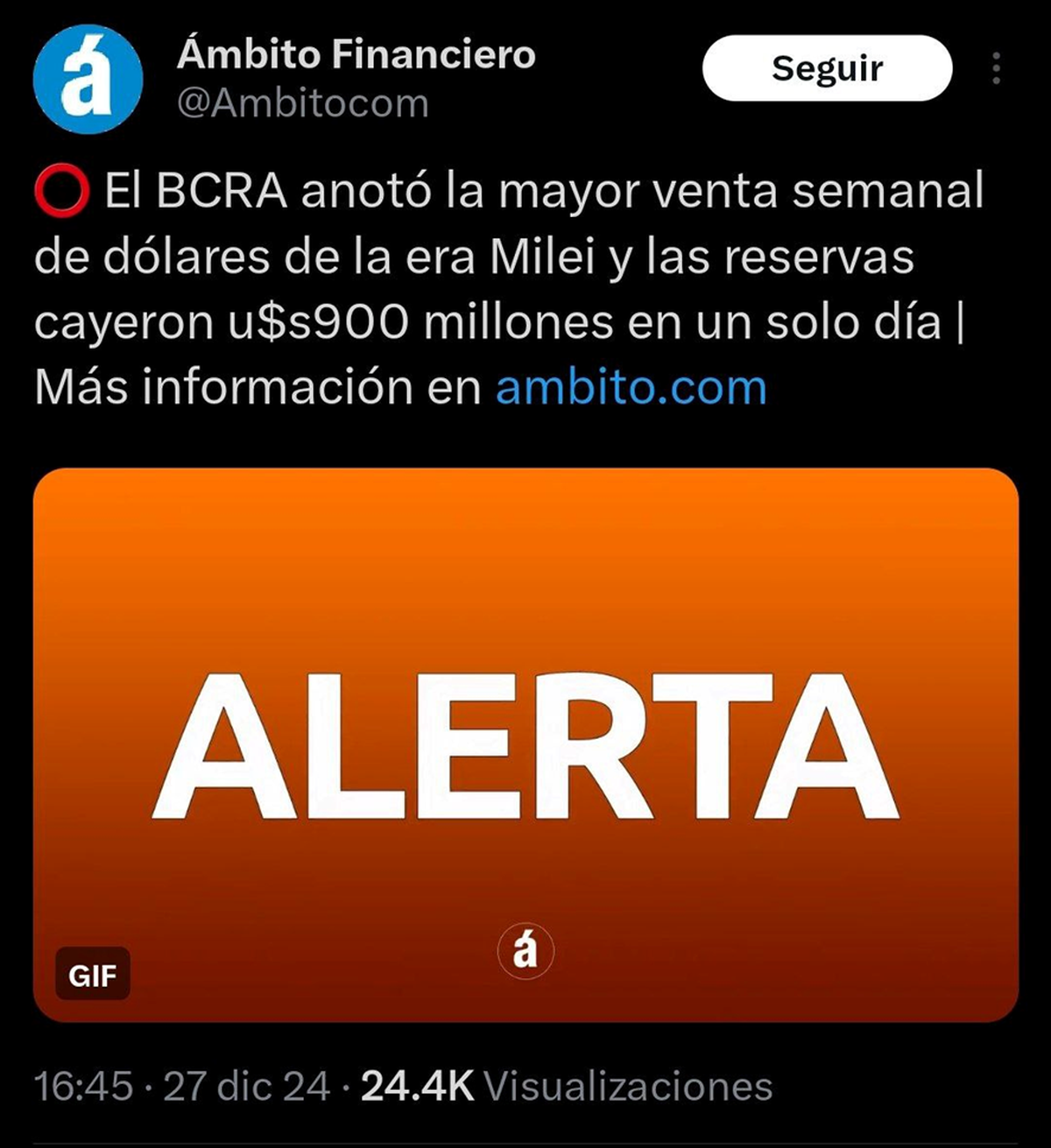 El jueves 26 de diciembre, tras dos días de inactividad por Navidad, se registró la mayor venta de reservas en 4 años porque, además, finalizaba el impuesto país y muchos habían postergado por ello sus operaciones de importación.
