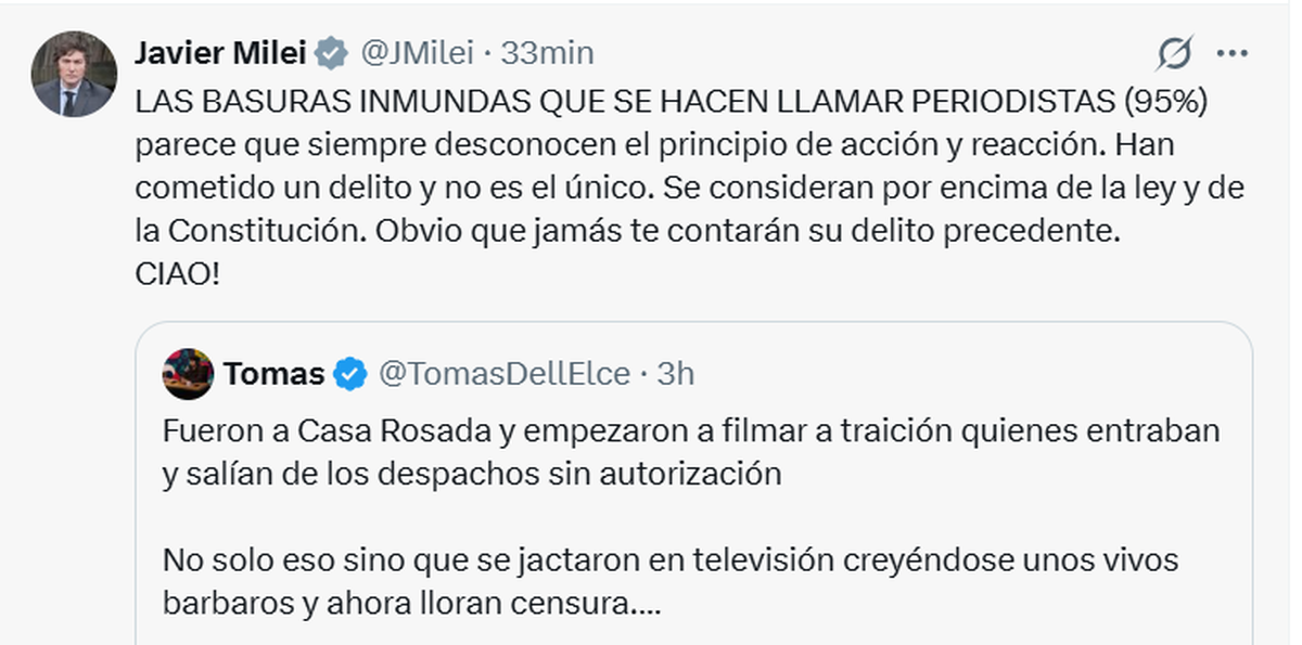 Hay delitos... y delitos. Esa parece ser la lógica de Javier Milei, quien cuando los escándalos lo salpican -como el caso de Manuel Adorni- pide que sea la Justicia se expida antes de opinar y/o actuar él, pero cuando se trata de ajenos (y por conveniencia propia) no tiene pruritos en afirmar la existencia de un delito. Y tomar medidas exageradas.